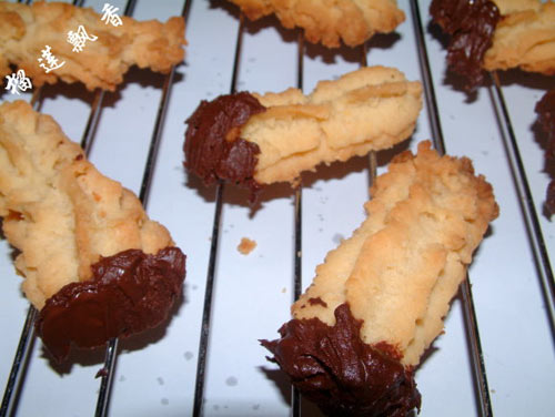 及以下步骤:用橡皮刮刀拌匀至没有干面粉。 准备大号菊花裱花嘴、裱花袋;把裱花袋前端剪开一个口,露出裱花嘴。 烤盘铺硅胶垫或烘焙用纸,面团装进裱花袋,挤出长条形。 烤箱预热180℃;烤盘先放入烤箱上层,烤焙10分钟;转放中层5分钟;关掉电源,利用余热继续烤焙5分钟;共计20分钟。 烤好后放烤盘上晾凉,即为奶酥。 苦甜巧克力隔开水溶化。 奶酥一端蘸上溶化的巧克力,晾凉,巧克力奶酥就完成了。 烤好后放烤盘上晾凉,即为奶酥。 苦甜巧克力隔开水溶化。 奶酥一端蘸上溶化的巧克力,晾凉,巧克力奶酥就完成了。