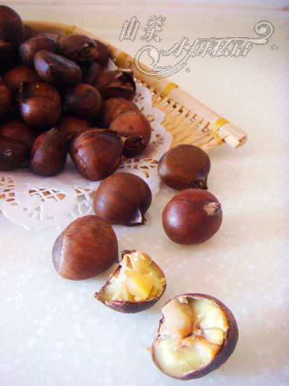 女人都爱吃零食,我也不例外,吃完饭还要坐那吃一会儿零食,大枣、榛子、开心果、杏仁、瓜子啥的,抓着啥吃啥。老公被我感染的也喜欢吃这些东西,家里的瓜子几天就一袋,儿子也喜欢吃,就是吃的太慢,常常没吃几个就被我们赶着写作业去了,可怜! 栗子也是俺喜欢滴零食,每次看到卖糖炒栗子的都走不动道,馋涎欲滴。可是现在糖炒栗子太贵了,总吃俺也舍不得啊!所以俺就买了生栗子回来自己炒,怎么也能省下几块不是,省点是点!买回家的生栗子,俺是左折腾右折腾,今儿用烤箱烤、明个用电饼铛烙,最后发现折腾来折腾去,做出来的糖炒栗子怎么也不如街上卖的那种好吃,人家是用大锅加砂子炒的啊,家里怎么弄跟人家比都差那么一点! 后来俺干脆不折腾了,就那么放锅里煮了吃,味道也不差,吃起来甜面甜面的,像烤地瓜似滴,就是有时候个别栗子煮出来水分有点大,口感稍差。后来俺又试着用锅蒸,嗯!这样似乎更好一些,几乎个顶个又甜又面,完全原汁原味!