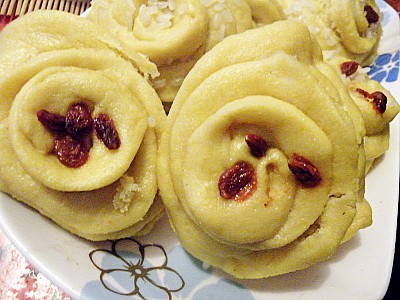 6、花卷镶嵌枸杞,上笼蒸20分钟,本来放了点泡好的糯米,蒸完全掉了。失败。