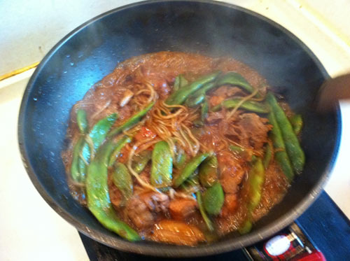 制作美食排骨豆角炖粉条。