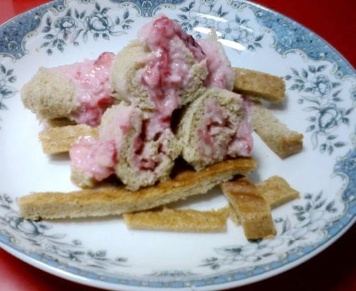 把酸奶加入草莓中,在加入面包片 又是一款营养的早餐,也可以用来做下午茶,朋友到家里来时做上一款草莓酪乳卷,既简单又健康,美容养颜。