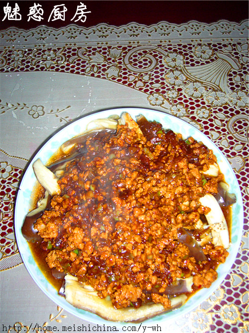 及以下步骤:倒入酱料,翻炒均匀至酱料滚起小泡泡。 取出蒸好的茄子,滗去碗里的水分,倒入盘中,再将酱料倒入即可。 茄子洗净一切两半。 撕成宽条摆入大汤碗。 放入蒸锅,开大火水开后蒸15分钟。 精肉剁成肉糜,葱姜切末,酱料调制好备用。 炒勺里加入食用油,撒入熟粒花椒粒炸出香味捞出,放入肉糜煸炒至发白,倒入少许料酒略加翻炒。 加入葱姜末略加翻炒。 倒入酱料,翻炒均匀至酱料滚起小泡泡。 取出蒸好的茄子,滗去碗里的水分,倒入盘中,再将酱料倒入即可。