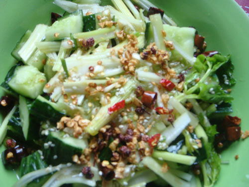 盐(少量) / 葱(1根) / 油(1大勺) / 白糖(半勺) / 香油(1勺) / 生抽(1勺) / 蒜(1个) / 醋(1勺) / 花椒(8颗) / 芝麻(适量) / 干红辣椒(3个)