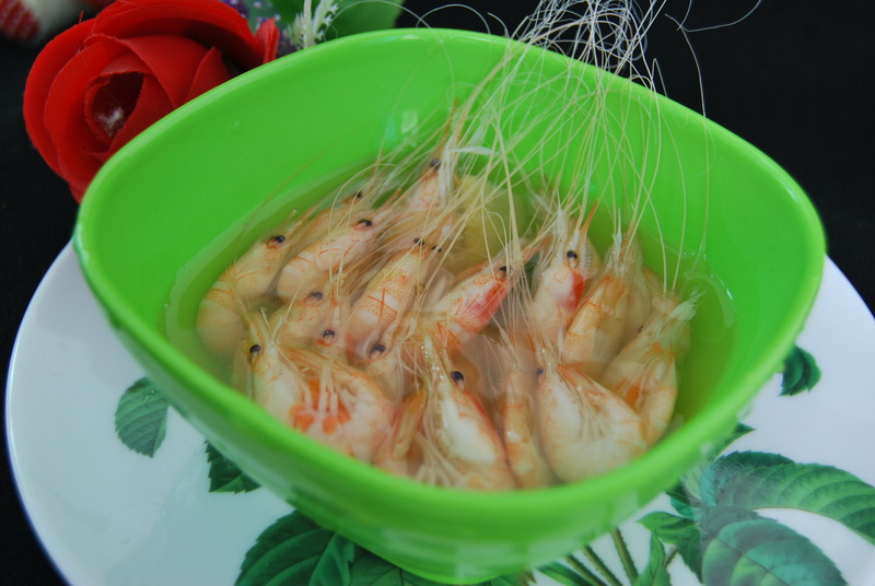 1、原料加工:先将海白虾放竹框内,用清水冲洗一下。