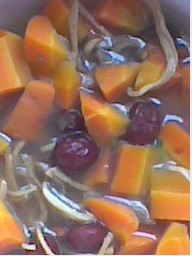 2、把红萝卜切成条状,鱿鱼切丝~ 红枣去核。