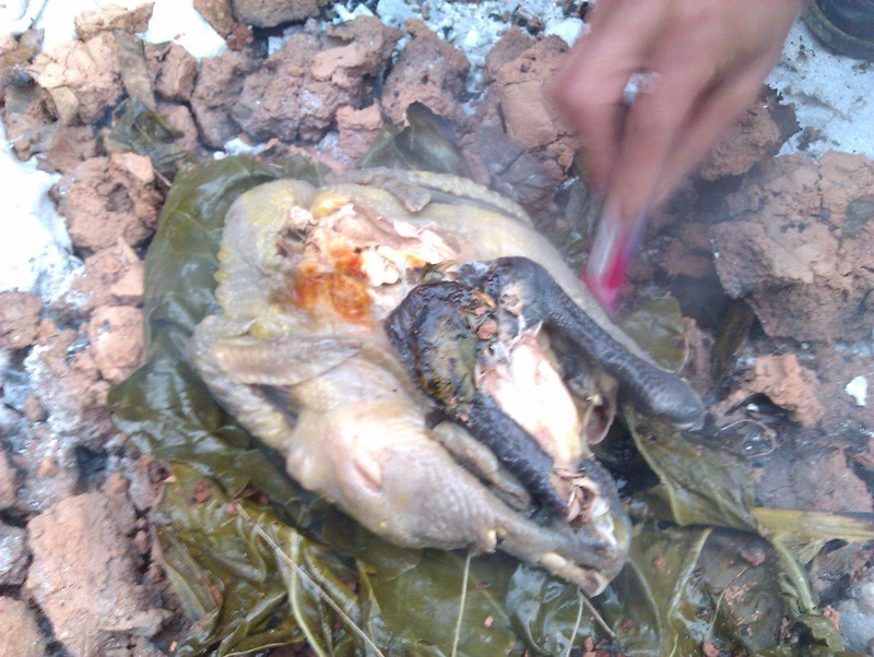 及以下步骤:2个半小时后就可以啦,用棍子轻敲烤过后的土,把土剥掉。 把荷叶剥掉就可以食用啦。 准备枯树枝,最好是龙眼树的枯树枝,因为别的树枝有味道。 用高岭土加水搅拌。 用搅拌好的高岭土涂在烧烤架上,要厚,大约在1公分左右。 用荷叶把鸡包好,荷叶要多包点,怕有缝隙,土会掉进进鸡里去了。 把包好的土鸡放在涂好的烧烤架上,在用高岭土均匀的涂在荷叶上,厚度1公分左右。 用树枝把土鸡上下用树枝盖起来,不能只烤下面,上面也要烤,这样土鸡才能烤均匀,要大火烤。 2个半小时后就可以啦,用棍子轻敲烤过后的土,把土剥掉。 把荷叶剥掉就可以食用啦。