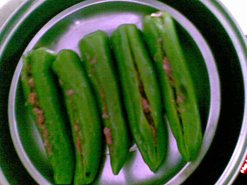 及以下步骤:竖划一刀、洗净后、加少许盐抹于椒身、 青椒5个、【2个人的材料】 竖划一刀、洗净后、加少许盐抹于椒身、 青椒5个、【2个人的材料】 竖划一刀、洗净后、加少许盐抹于椒身、 青椒5个、【2个人的材料】 竖划一刀、洗净后、加少许盐抹于椒身、 瘦肉洗净后剁碎、叫一小勺盐粉、鸡精、搅拌。入味后塞入青椒内、 麻油半勺、生抽半勺均匀滴落、放入锅内蒸。10分钟后开盖。 出炉喽、