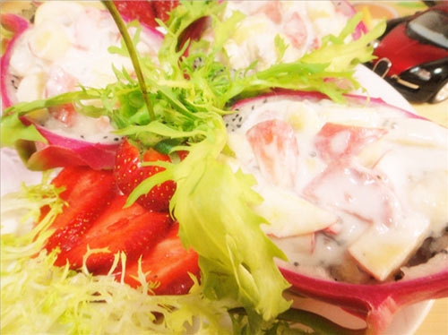 准备一些自己喜欢的水果,加入一些奶酪口味儿的酸奶,即成了美味爽口的沙拉餐品!