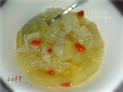 银耳的营养成分也很高,历代皇家贵族都将银耳看做是延年益寿之品、长生不老良药。银耳既有补脾开胃的功效,又有益气清肠的作用,还可以滋阴润肺。另外,雪梨有润肺清燥、止咳化痰、养血生肌的作用,冰糖也具有润肺止咳清痰去火的作用;总的来说这是一款美味却有不缺营养的美食。做这个炖品时还可以放莲子,只是家中没有咯,所以我加了几粒枸杞。