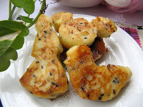 及以下步骤:把一小勺土豆泥,加些面粉,再加入牛奶。搅拌一下。(我分次加入土豆泥,这样好拌一些)。 土豆去皮,切片,蒸熟。趁热压成泥。 把一小勺土豆泥,加些面粉,再加入牛奶。搅拌一下。(我分次加入土豆泥,这样好拌一些)。 土豆去皮,切片,蒸熟。趁热压成泥。 把一小勺土豆泥,加些面粉,再加入牛奶。搅拌一下。(我分次加入土豆泥,这样好拌一些)。 土豆去皮,切片,蒸熟。趁热压成泥。 把一小勺土豆泥,加些面粉,再加入牛奶。搅拌一下。(我分次加入土豆泥,这样好拌一些)。 加入剩下的土豆泥,和芝麻。拌匀,就成比较干的泥了。 在案板上抹些油,把土豆泥装入模型内,模型内壁也要抹些油。压好形状后,拿掉模型,小心移入煎锅内,微火煎至两面金黄即可。 做好以后的样子。不是很成形,因为煎的时候泥有点析出外面,但总体形还是在的。