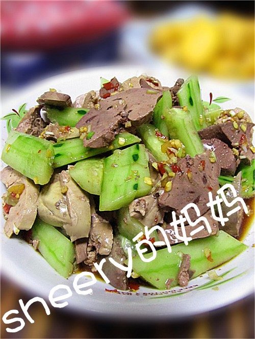 6、浇在黄瓜和鸡肝上,拌匀就行了。
