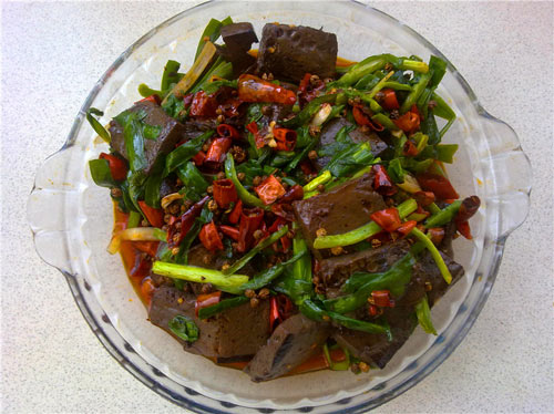 羊血主要成分为多种蛋白质,它补肾温脾、补血养血、血祛淤、续筋接骨;对慢性胃炎、吸收不良综合症、贫血有疗效。韭菜是菜中最有益者,李时珍说韭菜春食则香,这道菜鲜嫩、麻、辣、咸香扑鼻,营养价值很高。