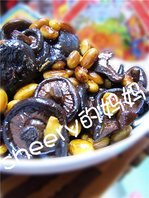 及以下步骤:放进熟黄豆。 倒入泡香菇的水。 看见那块黄色的冻冻吗,那是烤鸡翅留在锡纸上的油,也一起放进了。 倒进酱油。 撒上白糖。 盖上锅盖焖10分钟左右至香菇熟透。 加上点盐调味。 翻炒两下即可。 加上点盐调味。 翻炒两下即可。