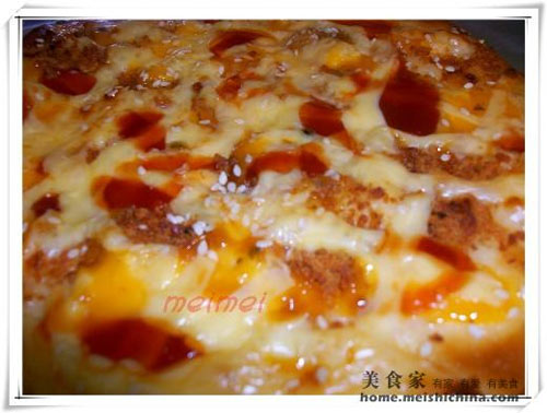 及以下步骤:面团上抹上一层美奶滋。 加入适量肉松。 芝士片切丝放上。 加入适量的千岛酱。一直重复之材料完。 最上层放上芝士丝排列在上。撒上适量的芝麻,辣椒酱及番茄酱即可。(忘了拍照) 预热烤箱170度,烤15分钟或表面呈金黄色即可。(个人烤箱温度不同,注意调整温度和时间) 成品图@@像不像批萨呢,来尝块吧。 来嘛...来嘛..呵呵。 成品图@@像不像批萨呢,来尝块吧。 来嘛...来嘛..呵呵。