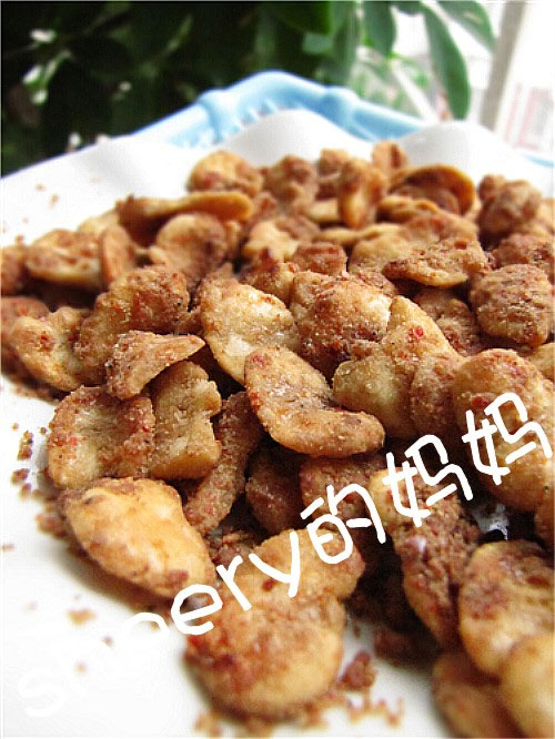 及以下步骤:将油倒出,在锅内放入四勺糖。 倒进40毫升水。 烧至糖水冒泡泡。 倒入炸好的豆瓣翻炒。 当糖水逐渐变稠,均匀撒上辣椒粉。 再撒上花椒粉。 继续不停地翻炒。 直到糖已结晶包裹在豆瓣上,豆瓣变得很松散,就可以关火了。 继续不停地翻炒。 直到糖已结晶包裹在豆瓣上,豆瓣变得很松散,就可以关火了。