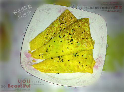 2、煎时蛋皮可以从锅底剥离就得马上取出,中间放馅快速折叠。趁着蛋皮一面还有粘性,热热的。