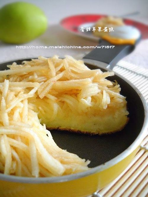 及以下步骤:蛋白加白糖打发。 打至干性发泡。 蛋白分两次加入蛋糊中。 平底锅烧热、加入油。倒入拌好的蛋糊。(可以煎出两个蛋糕) 调微火,加锅盖烤制。 2分钟后,蛋液凝固,加入苹果丝。再烤制2分钟,底部焦黄。 蛋白分两次加入蛋糊中。 平底锅烧热、加入油。倒入拌好的蛋糊。(可以煎出两个蛋糕) 调微火,加锅盖烤制。 2分钟后,蛋液凝固,加入苹果丝。再烤制2分钟,底部焦黄。