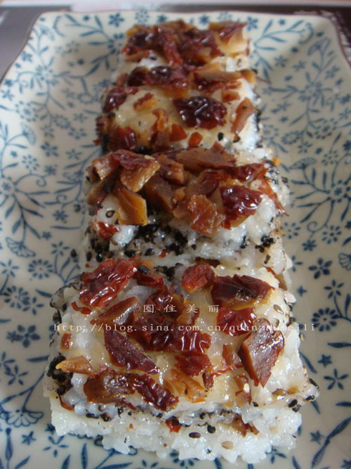 及以下步骤:将剩余的糯米饭倒入保鲜盒,压平后撒上黑枣末,继续按压紧实。 盖上盖子,放冰箱冷藏4小时。倒扣取出。 切块装盘即可,甜甜糯糯,混合着芝麻和黑枣的香气,直接用勺子挖着吃,也不错哦。 黑枣去掉枣核,切成末。 将糯米饭盛入一个大盘子里,趁热加3勺白砂糖,用饭勺不断搅拌,反复摔打糯米饭,增加粘性。 保鲜盒均匀刷上一层薄薄的玉米油,盛入少量糯米饭,用勺子压平后,撒上一层黑枣,再压上一层糯米饭,用勺子压平。 撒上芝麻碎,用勺子压平,尽量压紧实。芝麻没有粘度,所以比糯米饭好压很多。 将剩余的糯米饭倒入保鲜盒,压平后撒上黑枣末,继续按压紧实。 盖上盖子,放冰箱冷藏4小时。倒扣取出。 切块装盘即可,甜甜糯糯,混合着芝麻和黑枣的香气,直接用勺子挖着吃,也不错哦。