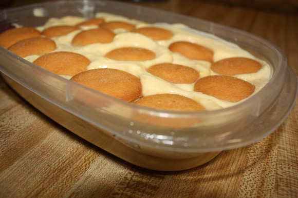 3、将香草威化饼在容器底部平铺一层。倒入一半的布丁糊。铺上一层香蕉片。倒入剩下的一半布丁糊。再铺一层香草威化饼。