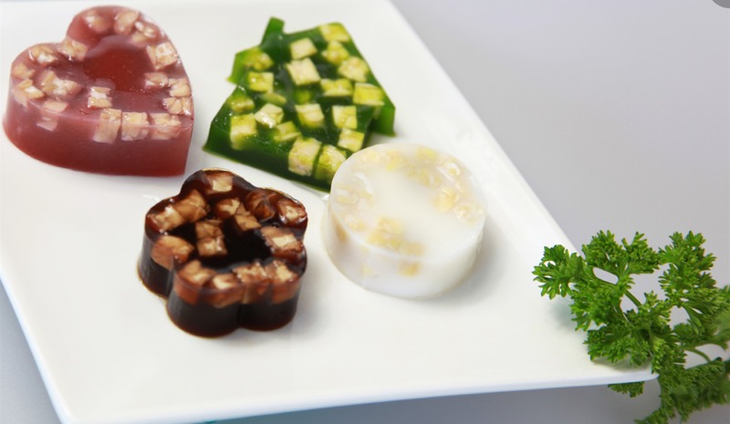 及以下步骤:模具里适量放入焯好的天贝丁,不同的汁分别倒入不同的模具里,然后把模具放入冰箱冷藏,8-10分钟成型即可拿出。 把琼脂放入锅里,加水煮开,待琼脂化开,关火备用。 模具里适量放入焯好的天贝丁,不同的汁分别倒入不同的模具里,然后把模具放入冰箱冷藏,8-10分钟成型即可拿出。 把琼脂放入锅里,加水煮开,待琼脂化开,关火备用。 模具里适量放入焯好的天贝丁,不同的汁分别倒入不同的模具里,然后把模具放入冰箱冷藏,8-10分钟成型即可拿出。 天贝切小丁,过热水焯一下,捞出,过凉水备用。 把琼脂放入锅里,加水煮开,待琼脂化开,关火备用。 菠菜汁:把菠菜切碎,挤出汁,备用。 调汁: 模具里适量放入焯好的天贝丁,不同的汁分别倒入不同的模具里,然后把模具放入冰箱冷藏,8-10分钟成型即可拿出。