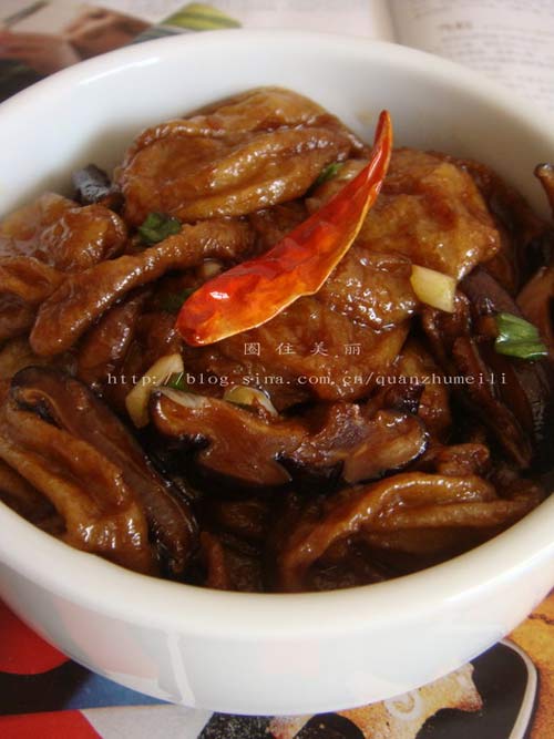 及以下步骤:干香菇用温水泡发后,切成细丝。 泡香菇的水不要倒掉,滤掉杂质备用。 干香菇用温水泡发后,切成细丝。 泡香菇的水不要倒掉,滤掉杂质备用。 干香菇用温水泡发后,切成细丝。 泡香菇的水不要倒掉,滤掉杂质备用。 锅中加水烧开,放入油面筋,用铲子压扁,变软后,立即捞出沥干水分。 炒锅中倒入油,放入八角,出香味后加入香菇翻炒几下。 倒入油面筋翻炒,加干辣椒,1勺蚝油,适量冰糖,少量老抽和盐调味。 翻炒均匀后加入泡香菇的水,中小火焖5分钟。大火收汁,淋上几滴香油,撒上葱末即可。