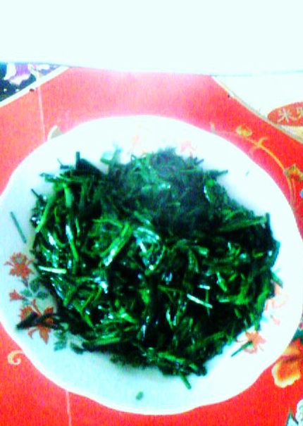 4、放入韭菜翻炒。【韭菜的辛辣味较重,一般不用葱姜蒜之类的小料爆锅】。