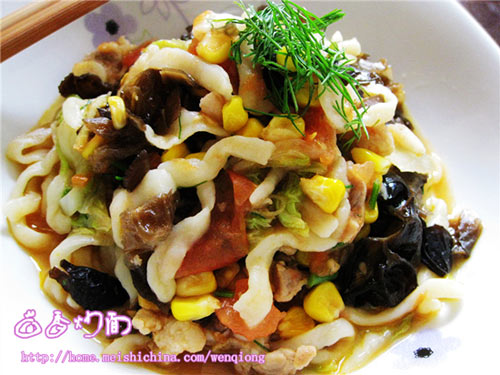 及以下步骤:煮熟后捞出泡到冷水里。 木耳和白菜切好。 将白菜放到先前煮面条的水里烫一下。 捞出来和面条一起过凉水。 切好肉、番茄、生姜。 准备好小茴香。 热锅放油,爆香生姜后放入猪肉。 待猪肉变色,加入番茄。 加入木耳翻炒,加盐。 搅拌均匀即可。