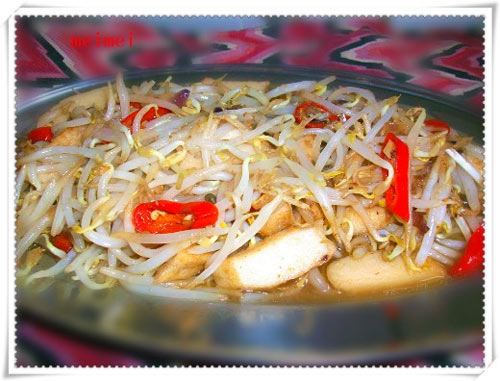 3、把豆芽一并加入梅香里大火快速翻炒即可 。