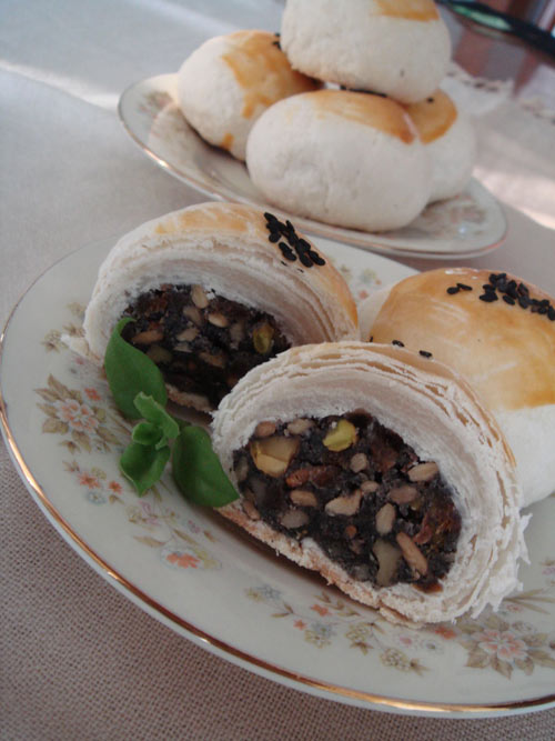 附上五仁馅做法:1、把核桃仁、开心果、杏脯切碎后和葡萄干、黑芝麻、葵花籽仁混合拌匀