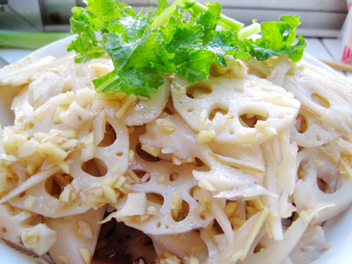 及以下步骤:藕洗净后切片。 姜切末备用。 藕洗净后切片。 姜切末备用。 藕洗净后切片。 姜切末备用。 烧一锅热水把藕片放入焯熟。 开锅后的藕片过凉水,最后一遍过凉白开。 闭干净水的藕放入一个锅内放入姜末。 放入醋,盐,味精,糖适量拌匀装盘即可。
