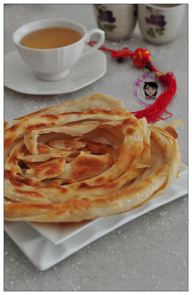 及以下步骤:面粉用温水和成面团,醒20分钟。 油烧热,用花椒,大料一起熬。熬好后浇在少许的面粉上,搅拌成糊。 面粉用温水和成面团,醒20分钟。 油烧热,用花椒,大料一起熬。熬好后浇在少许的面粉上,搅拌成糊。 面粉用温水和成面团,醒20分钟。 油烧热,用花椒,大料一起熬。熬好后浇在少许的面粉上,搅拌成糊。 面粉用温水和成面团,醒20分钟。 擀成一张很大的饼皮,薄一些。刷上过程1中的面糊,即油酥。 叠好后,卷起,边拉伸边卷。卷好后擀平,放入饼铛中烙至两面金黄。 期间最好能翻面,刷油。