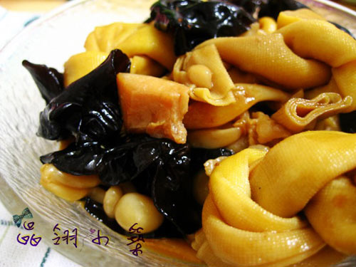 5、放入百叶结黑木耳,加少许高汤烧一下。