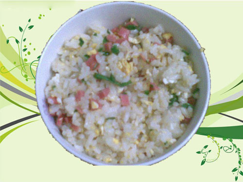 及以下步骤:炒饭出锅了。 菜籽油下锅烧热,下鸡蛋炒散。 加入米饭翻炒。 菜籽油下锅烧热,下鸡蛋炒散。 加入米饭翻炒。 火腿肠,大蒜切碎备用。 炒好的米饭加盐。 加入火腿肠。 翻炒一下撒入蒜花。 炒饭出锅了。