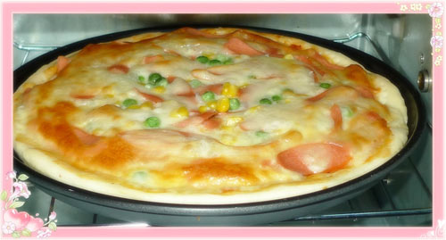 及以下步骤:摆切片的火腿。 再撒上洋葱青豆玉米粒。 放马苏里拉奶酪。入烤箱,220度,20分钟。 15分钟后拿出来,再撒上一些马苏里拉奶酪。 出炉喽!用披萨刀来一块啊,有拉丝啊,好长! 摆切片的火腿。 再撒上洋葱青豆玉米粒。 放马苏里拉奶酪。入烤箱,220度,20分钟。 15分钟后拿出来,再撒上一些马苏里拉奶酪。 出炉喽!用披萨刀来一块啊,有拉丝啊,好长!