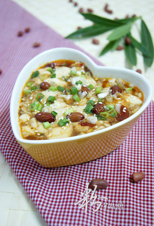 及以下步骤:加入葱花、花椒粉、糖、鸡清,搅拌均匀即可。 主料、配料备好。 葱切成粒备好。 主料、配料备好。 葱切成粒备好。 芝麻炒香,花生放入油锅炸香,沥干油备用。 另锅下油放入郫县豆瓣慢火炒出红油。 把豆花放入,摇动锅让酱汁渗入豆花里,煮1-2分钟。 放入熟花生米。 加入葱花、花椒粉、糖、鸡清,搅拌均匀即可。