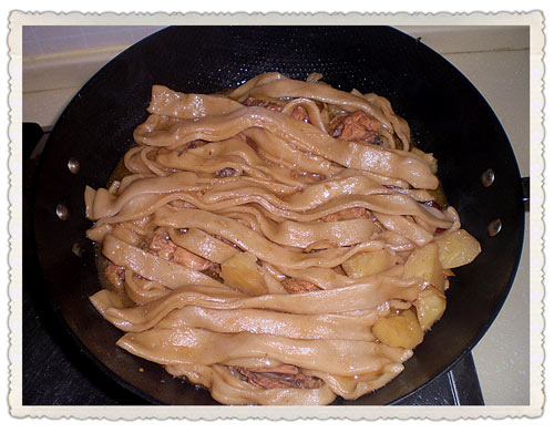 及以下步骤:变色后倒入2勺酱油和2碗水,水稍微多加点比较好。 将面粉和成面团,醒10分钟,然后擀成较薄的面皮,切成大约1cm宽的长条。 加入土豆,大火烧开,加盐翻均匀。将宽面条摆在锅内,小火慢炖。 至汤汁差不多收干后既可以出锅。 放入鸡块和少量的料酒炒香。 将鸡肉翻炒至变色。 变色后倒入2勺酱油和2碗水,水稍微多加点比较好。 将面粉和成面团,醒10分钟,然后擀成较薄的面皮,切成大约1cm宽的长条。 加入土豆,大火烧开,加盐翻均匀。将宽面条摆在锅内,小火慢炖。 至汤汁差不多收干后既可以出锅。