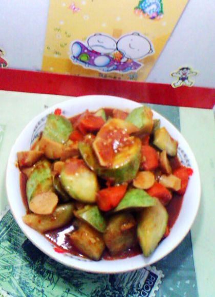 及以下步骤:锅留底油,爆香葱姜。 依次下入角瓜、鸡肉肠、胡萝卜,翻炒均匀。 放辣椒酱,并将其翻炒均匀。 然后,加料汁、盐、糖调味,加适量水烧开,用中火烧制5分钟左右。 加味精提鲜。淋入水淀粉勾薄芡,待芡汁糊化后,淋入适量明油。 即可出锅装盘。 放辣椒酱,并将其翻炒均匀。 然后,加料汁、盐、糖调味,加适量水烧开,用中火烧制5分钟左右。 加味精提鲜。淋入水淀粉勾薄芡,待芡汁糊化后,淋入适量明油。 即可出锅装盘。