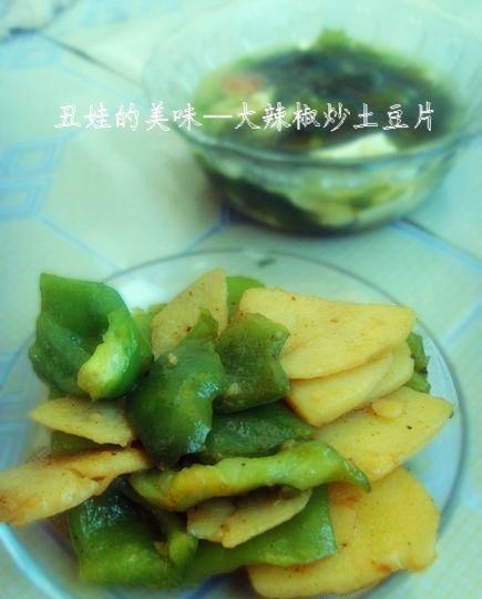 及以下步骤:2个大辣椒洗净,1个土豆洗净去皮。 把大辣椒掰成小块,土豆切成片并泡于水中。 2个大辣椒洗净,1个土豆洗净去皮。 把大辣椒掰成小块,土豆切成片并泡于水中。 2个大辣椒洗净,1个土豆洗净去皮。 把大辣椒掰成小块,土豆切成片并泡于水中。 1大勺豆油热后放入土豆片进行煎炒。 待土豆八成熟时放入大辣椒翻炒。 放入1/2小勺花椒粉调味。 出锅前放入1克蒜末和1小勺精盐调味,并翻炒均匀。