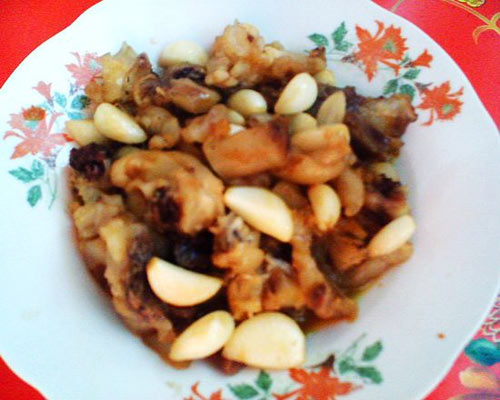 蹄筋中含在丰富的胶原蛋白质,并且不含胆固醇。经常食用能使皮肤更富有弹性和韧性,延缓皮肤的衰老。据说还有强筋壮骨之功效。 蹄筋为筵席佳品,口感滑嫩不腻,质地犹如海参,故有俗语说:牛蹄筋,口感赛海参。 平时食用多以牛蹄筋为上品。 蒜仔:大蒜去皮炒熟即为蒜仔。