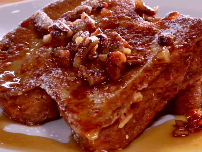 及以下步骤:从烤箱取出面包片,两片一组在3中浸泡两面。 与此同时,用12英寸的不粘锅融化1大勺黄油, 将浸泡了面糊的面包片在热锅里煎制,煎至金黄褐色(大约用二分半钟)。 与此同时,将2大汤匙黄油融化并连同牛奶,鸡蛋,砂糖,香草,肉桂粉和盐在混合在一个中号碗中。慢慢加入面粉并慢慢打至匀滑。将面糊平摊在一个大浅盘里。 从烤箱取出面包片,两片一组在3中浸泡两面。 与此同时,用12英寸的不粘锅融化1大勺黄油, 将浸泡了面糊的面包片在热锅里煎制,煎至金黄褐色(大约用二分半钟)。 与此同时,将2大汤匙黄油融化并连同牛奶,鸡蛋,砂糖,香草,肉桂粉和盐在混合在一个中号碗中。慢慢加入面粉并慢慢打至匀滑。将面糊平摊在一个大浅盘里。 从烤箱取出面包片,两片一组在3中浸泡两面。 与此同时,用12英寸的不粘锅融化1大勺黄油, 将浸泡了面糊的面包片在热锅里煎制,煎至金黄褐色(大约用二分半钟)。 糖浆: 法国吐司: 与此同时,将2大汤匙黄油融化并连同牛奶,鸡蛋,砂糖,香草,肉桂粉和盐在混合在一个中号碗中。慢慢加入面粉并慢慢打至匀滑。将面糊平摊在一个大浅盘里。 从烤箱取出面包片,两片一组在3中浸泡两面。 与此同时,用12英寸的不粘锅融化1大勺黄油, 将浸泡了面糊的面包片在热锅里煎制,煎至金黄褐色(大约用二分半钟)。 煎好的面包片,蘸上1的糖浆即成。