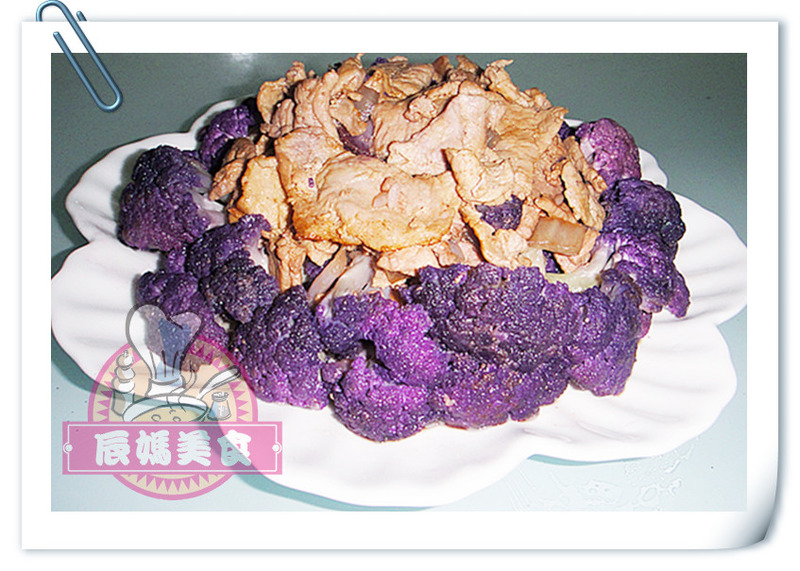 去买菜的时候看见了唯一的一棵很独特的花菜,紫色的,赶紧把它买走了,估计不好卖吧,不贵2元一斤,第一次见难免有点害怕,上网一查还真有这品种,老公回来看见问我你用什么把菜花染成那样了,吓得不敢吃,呵呵 紫菜花:含有丰富的天然花青素及硒、钙、铁等人体必需的微量元素。而花青素是一类色素,存在于各种水果和花朵以及蔬菜中,比较奇特的是其细胞液为碱性时呈红色,酸性时则为蓝色。花青素具有极强的抗氧化作用,可以抵御自由基对人体的损伤,预防关节炎、癌症、心脏病等多种疾病。同时,它还具有抗辐射的作用,对于白领或是长期处于日晒、电辐射环境中的人群,花青素的功效可是不可或缺的。