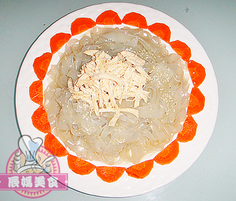 及以下步骤:粉皮装盘,上面盖上鸡丝,撒上芝麻。 准备好食材。 粉皮用冷水泡软捞出。 准备好食材。 粉皮用冷水泡软捞出。 再放入开水里焯片刻继续捞入冷水中。 锅里放水加适量食盐加热,水开后放入鸡脯肉煮片刻至熟,捞出按照鸡肉纹理撕成细丝备用。 粉皮捞出控水,加入食盐、芥末油、凉拌菜料、鸡精、香油拌匀。 胡萝卜切圆片,从中间剖开,入水焯至断生,围盘装饰。 粉皮装盘,上面盖上鸡丝,撒上芝麻。