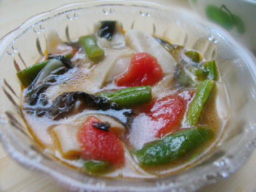 及以下步骤:锅内加油,爆葱花。 加入豆角段爆炒。加入调味料。因为豆角比较难熟,应加入适量水煎煮。 待炒至豆角变色后加入西红柿块翻炒。 锅内加水,烧开,煮入面片。 煮沸后加入少量冷水,再烧开。如此两次。加入洗好的香芹叶。 加入炒好的豆角。 加少量紫菜。愿意的话也可以加入鸡蛋。因为家里的鸡蛋刚好吃完了,所以,嘿嘿……就省了。 盛碗。开始米西。喜欢吃辣的盆友可以加入油泼辣子。那真叫一个香啊!我的这个因为是给宝贝吃的,所以就没加。 加少量紫菜。愿意的话也可以加入鸡蛋。因为家里的鸡蛋刚好吃完了,所以,嘿嘿……就省了。 盛碗。开始米西。喜欢吃辣的盆友可以加入油泼辣子。那真叫一个香啊!我的这个因为是给宝贝吃的,所以就没加。