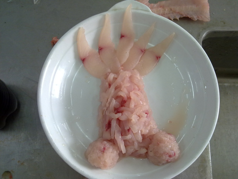 5、将200克的鱼剁成茸然后揉成球形 大小约乒乓球的3分之2 放在鱼丝的前面