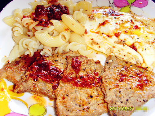糖(10g) / 鸡蛋(1个) / 白醋(5g) / 番茄酱(15g) / 黄油(25g) / 红酒(10mml) / 通心粉(50g) / 蒙特利尔牛排腌料(25g)