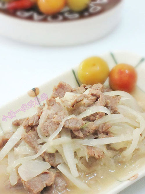 及以下步骤:洗净锅放油爆香葱头,滑入牛肉大火快炒至稍变色。 放入已经炒熟的萝卜丝,和在一起稍焖煮十几秒即可。 牛肉切块用生抽、玉米淀粉、姜茸、葱头、花生油腌制一个小时。萝卜切丝备用。 牛肉腌够一个小时后,用水冲洗干净里面的淀粉。 洗净牛肉后,再放一次玉米淀粉(这次的量是前一次的四分之一)、生抽、胡椒粉、葱头、花生油进行腌制。 锅烧热油,放葱头入爆香。 爆香葱头后,放入萝卜丝大火快炒。 炒至萝卜丝熟透,放盐调好味后装碟备用。 洗净锅放油爆香葱头,滑入牛肉大火快炒至稍变色。 放入已经炒熟的萝卜丝,和在一起稍焖煮十几秒即可。