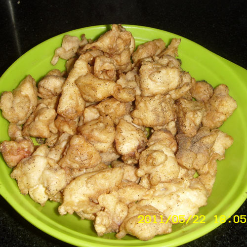 及以下步骤:腌制入味的鸡丁。放入少许面粉和淀粉,拌匀,进行炸制。 锅中烧油。油8分热的时候。放入鸡段儿。 第一遍,炸熟 第二遍炸制上色 金黄色,捞出。 洒上黑胡椒粉拌匀即可 第一遍,炸熟 第二遍炸制上色 金黄色,捞出。 洒上黑胡椒粉拌匀即可