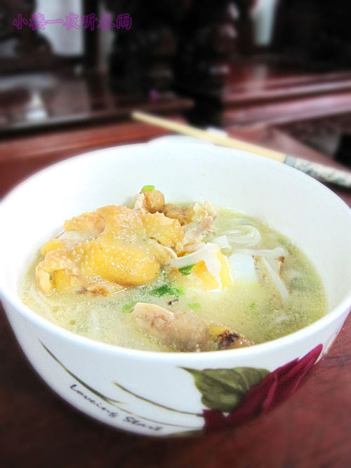 这是用中午吃剩的鸡肉做的鸡肉粉,方便快捷。让剩菜来个华丽的转身!配上稍煎过的鸡蛋,味道好吃极啦!河粉里有鸡肉的鲜美!