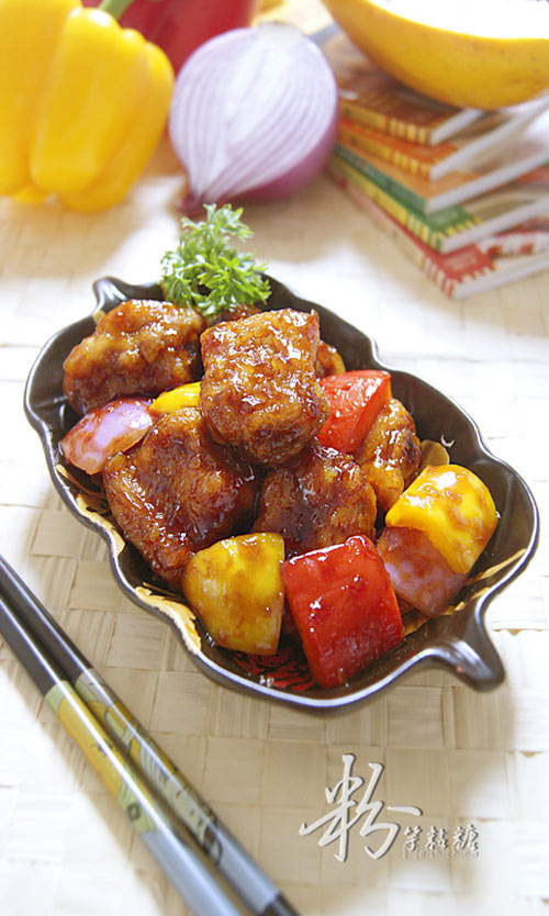 及以下步骤:干锅下油烧至油温5成热时(冒泡),放入排骨炸约10秒,然后改用小火炸至排骨表面凝固浮在油面上后捞出(大约5分钟)。 再用中高温热油复炸一次,然后沥净油份盛入碗中。 炒锅倒入味汁和1碗清水,小火熟至沸腾。 倒入炸好的排骨,翻炒均匀使酱汁均匀裹在排骨上。 倒入洋葱、红黄椒片翻炒片刻即可。 干锅下油烧至油温5成热时(冒泡),放入排骨炸约10秒,然后改用小火炸至排骨表面凝固浮在油面上后捞出(大约5分钟)。 再用中高温热油复炸一次,然后沥净油份盛入碗中。 炒锅倒入味汁和1碗清水,小火熟至沸腾。 倒入炸好的排骨,翻炒均匀使酱汁均匀裹在排骨上。 倒入洋葱、红黄椒片翻炒片刻即可。