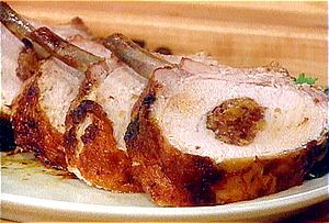 及以下步骤:在一小碗里加入酸奶油和芥末混合均匀,加入适量盐、胡椒粉调味作为沾料。 在食品加工机把杏仁、香葱、黄油、茴香籽、1 / 2茶匙盐和胡椒混合搅碎即成调味料。 将猪肋骨沿关节切开成3英寸厚的排,然后把猪排顶端的肉推到关节处再把关节处的骨头剔除并把1的馅料嵌进里面。 在一小平底锅里加入干邑和水加热,然后加入蔓越莓果脯 在食品加工机把杏仁、香葱、黄油、茴香籽、1 / 2茶匙盐和胡椒混合搅碎即成调味料。 将猪肋骨沿关节切开成3英寸厚的排,然后把猪排顶端的肉推到关节处再把关节处的骨头剔除并把1的馅料嵌进里面。 烤箱预热到350度。 在整理好的猪肋排上撒上盐和胡椒粉调味,然后平底锅加油进行煎制6分钟。 将煎好的猪排刷上2放入烤箱,猪肉面朝下烤30分钟。 在一小碗里加入酸奶油和芥末混合均匀,加入适量盐、胡椒粉调味作为沾料。